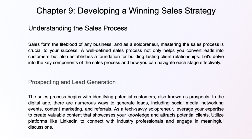 Introduction Chapter 1: The Solopreneur Mindset Chapter 2: Navigating the IT Landscape Chapter 3: Crafting Your Business Idea Chapter 4: Building Your Personal Brand Chapter 5: Strategic Planning and Goal Setting Chapter 6: Financial Management for Solopreneurs Chapter 7: Building a Strong Online Presence Chapter 8: Effective Time Management Chapter 9: Developing a Winning Sales Strategy Chapter 10: Delivering Exceptional Value Chapter 11: Scaling and Expansion Conclusion Tools